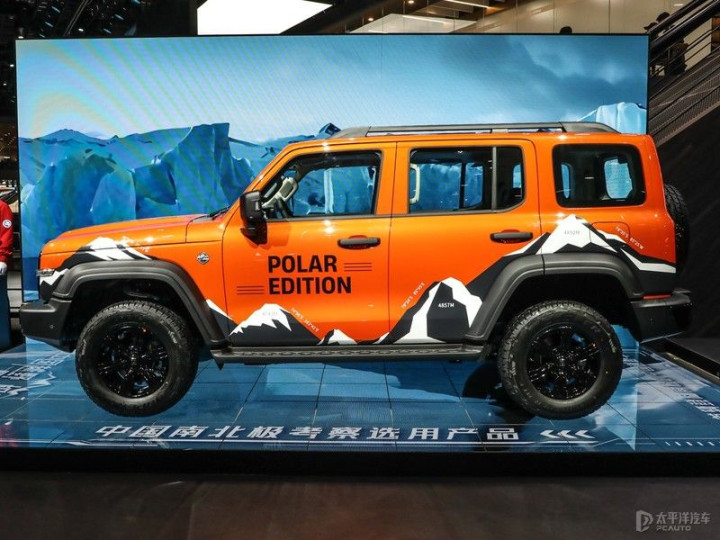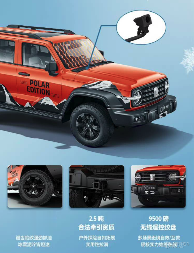 3.外观亮点:配有极地橙专属配色、极地锋芒”车身拉花与特殊LOGO,前风挡加热和喷嘴加热、全地形AT轮胎、无线遥控绞盘(9500磅)和2.5吨牵引资质;